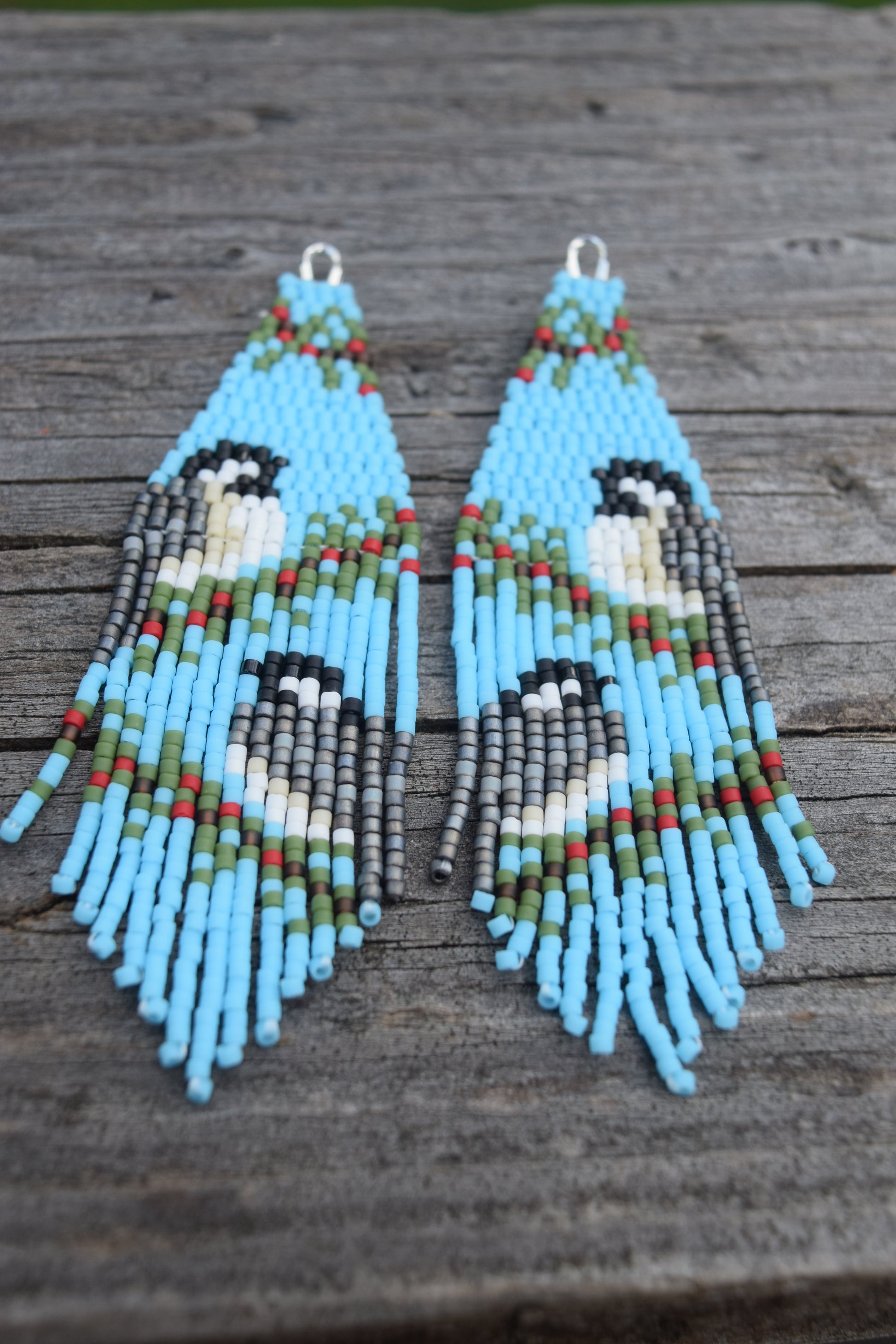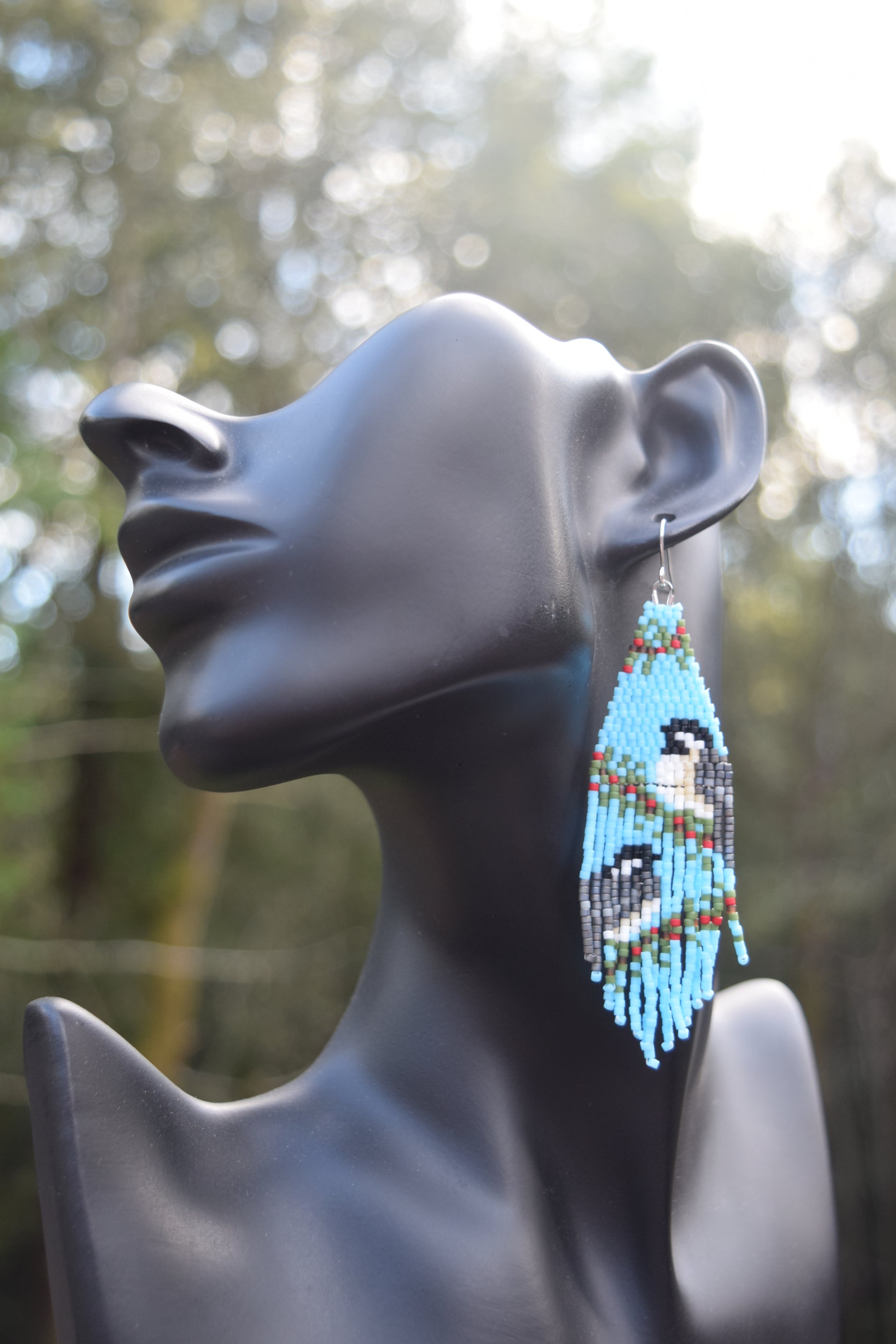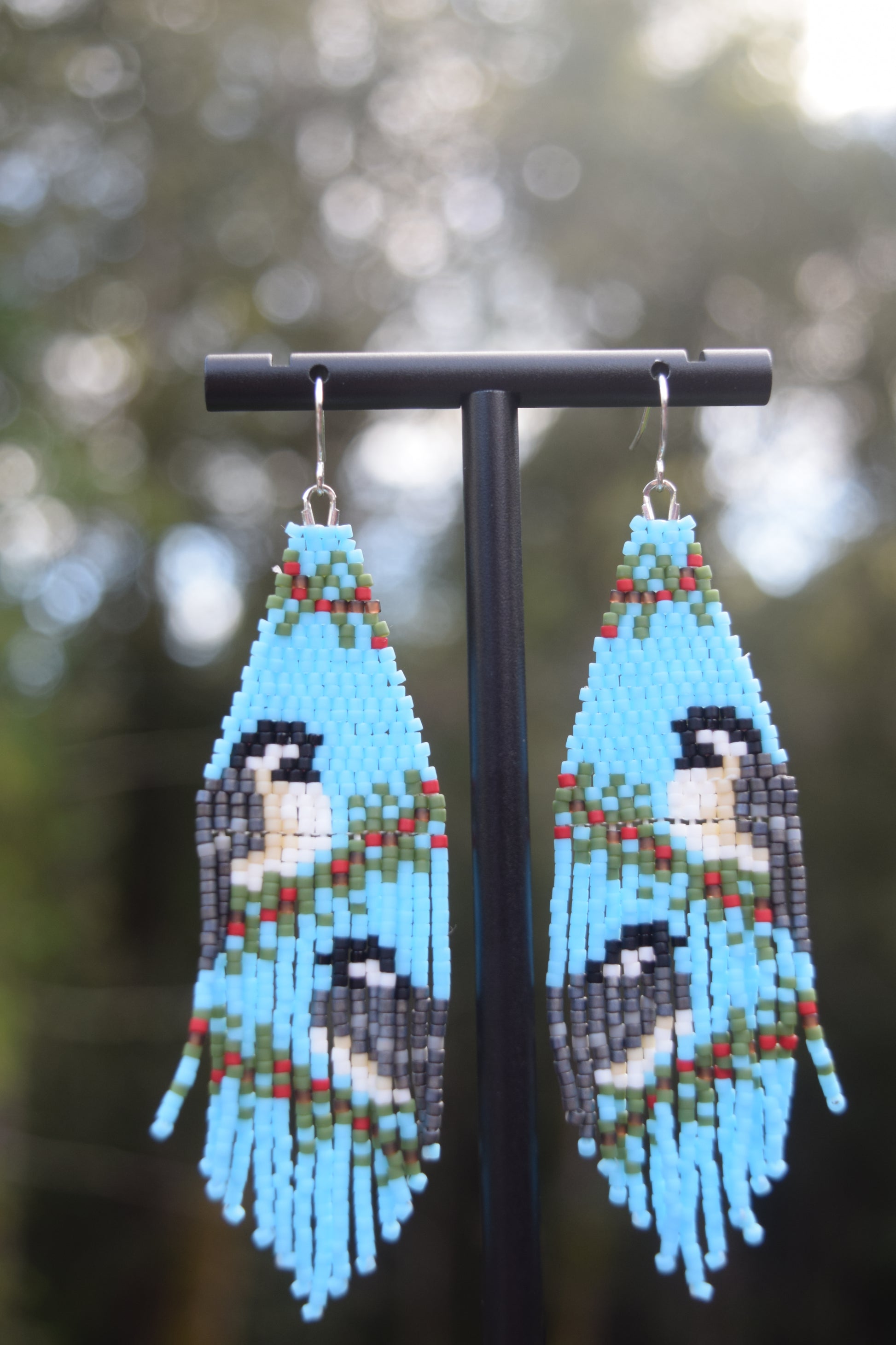 Do these birds grace your yard? I’m lucky enough to have them in mine! They seem to be more present in the colder months, hopping around the yard eating bugs and grass seed. Sometimes there are huge flocks of them! These sweet earrings were hand woven with a double drop brick stitch, using 11/0 Myuki Delica glass beads and finished off with silver hooks. This pair hangs at approximately 3.5”.