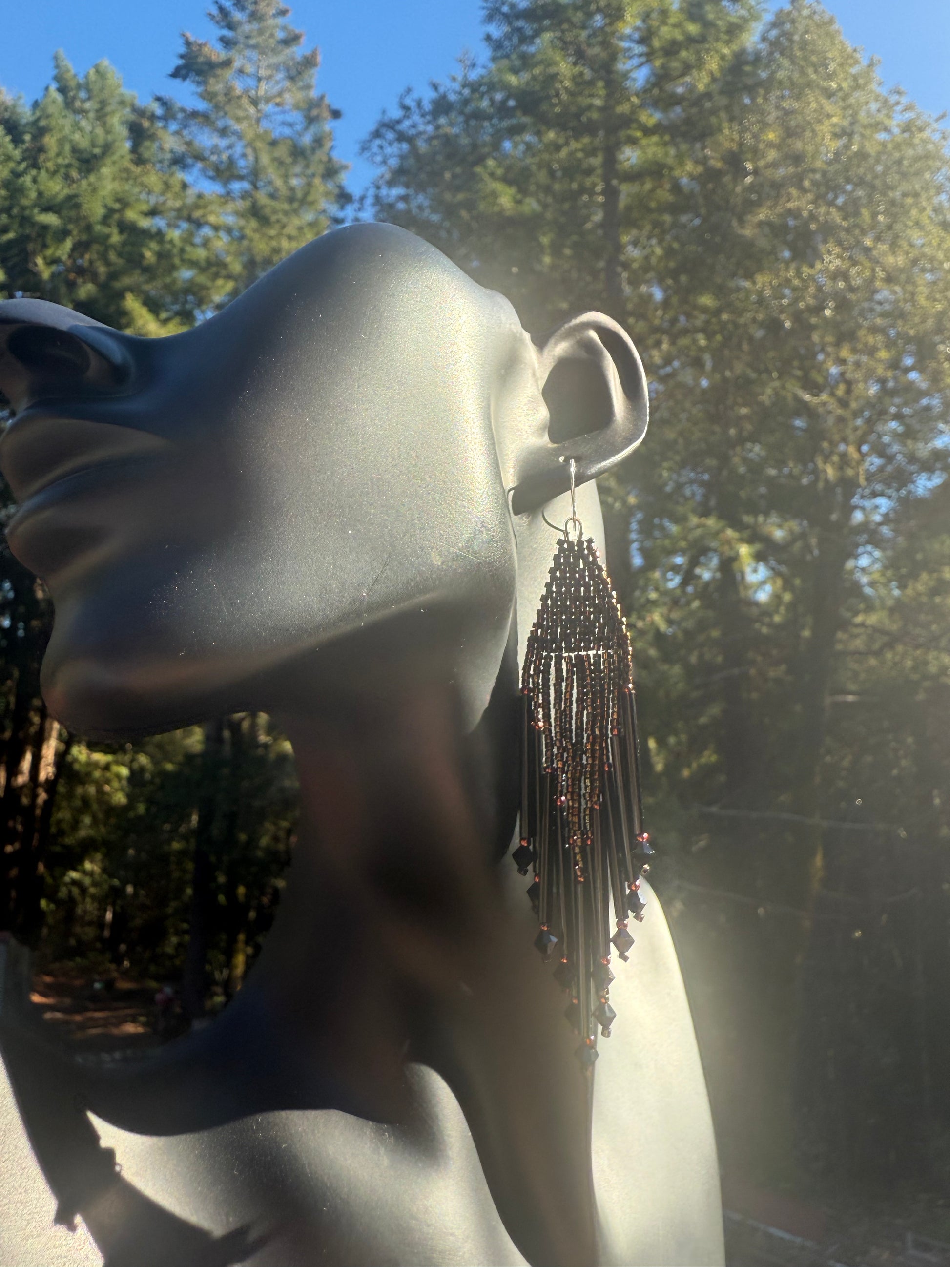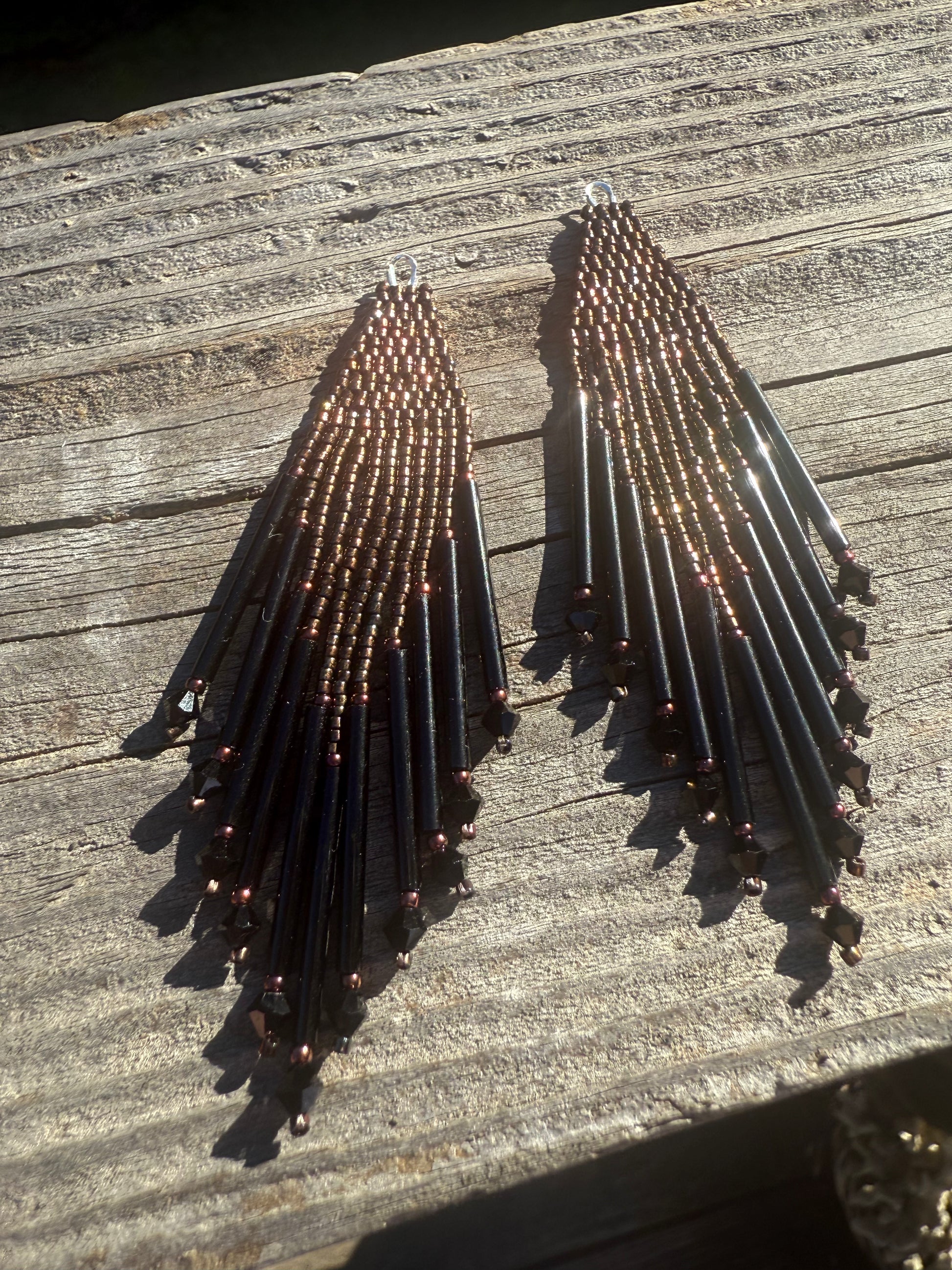Introducing Bronze Beauty, our handcrafted earrings that will add a touch of warmth and elegance to your style. Each pair is carefully woven with 11/0 Myuki Delica Glass seed beads and finished with 925 sterling silver hooks. The combination of sparkling bronze and jet black beads creates a unique and sophisticated look. Elevate any outfit with these beautiful earrings.
