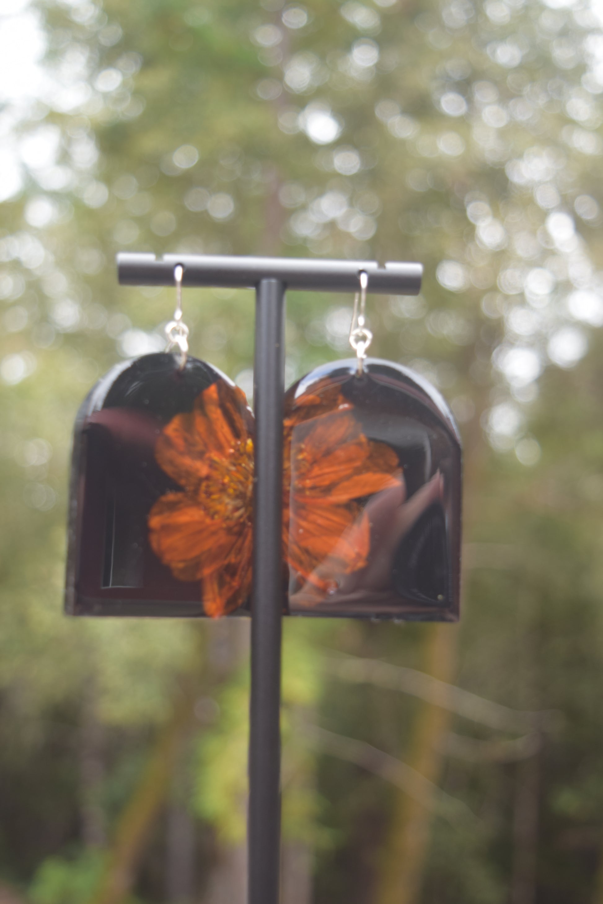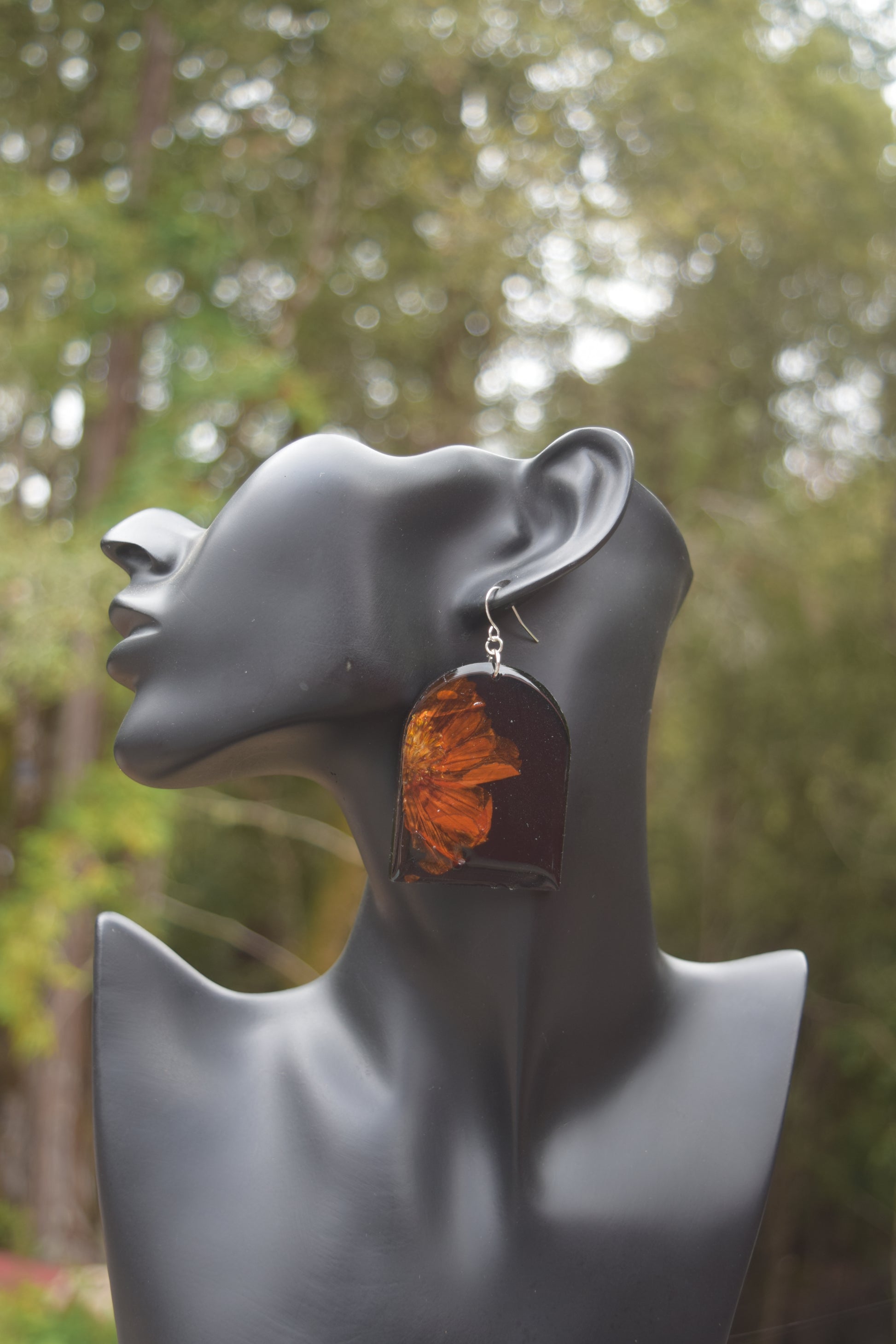Add a touch of nature to your accessory collection with Floral Tombs. Handcrafted with dried flowers and 925 sterling silver hooks, these unique earrings feature autumn colors and a durable resin casing. Embrace the natural beauty of these 2x1.5 inch earrings.