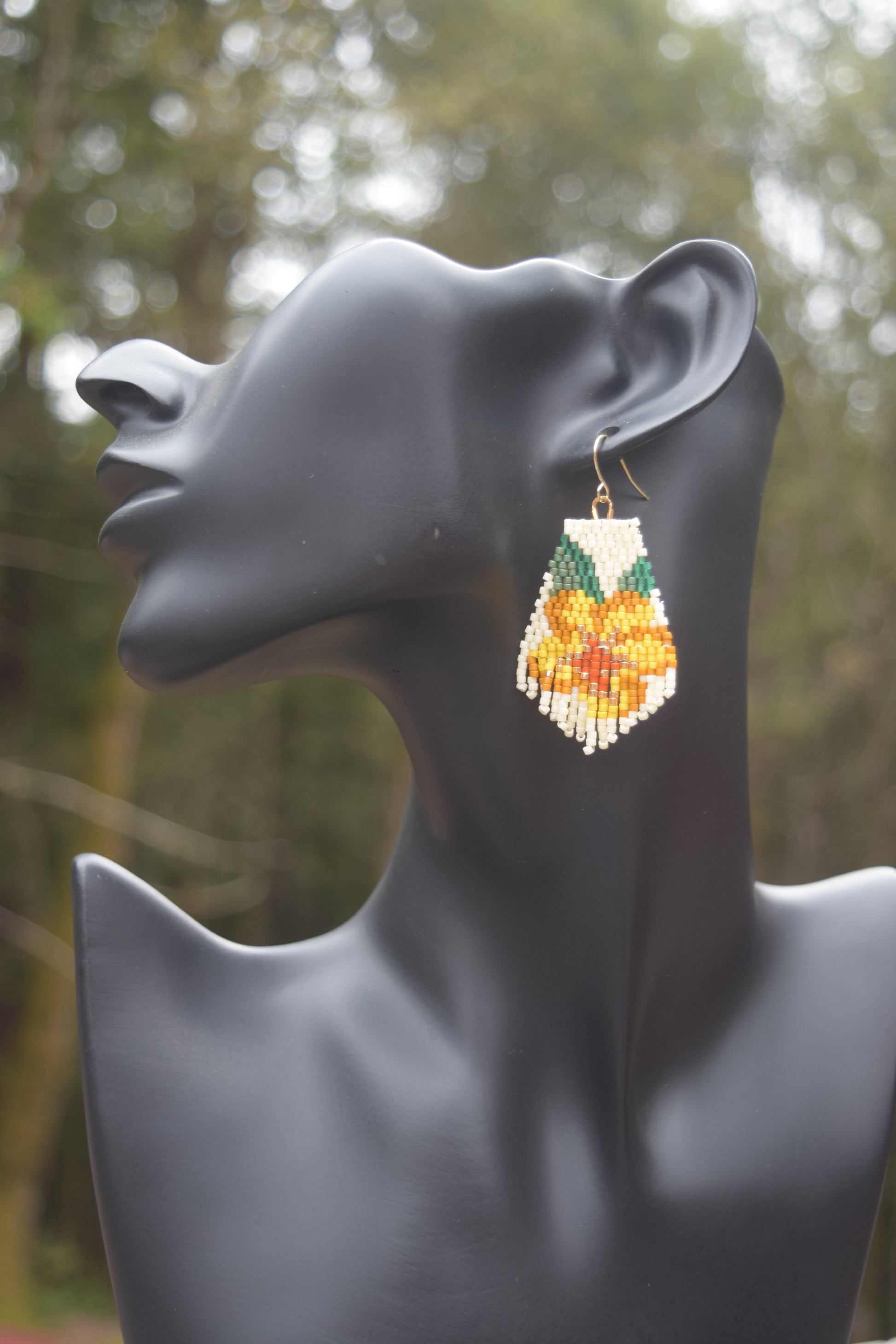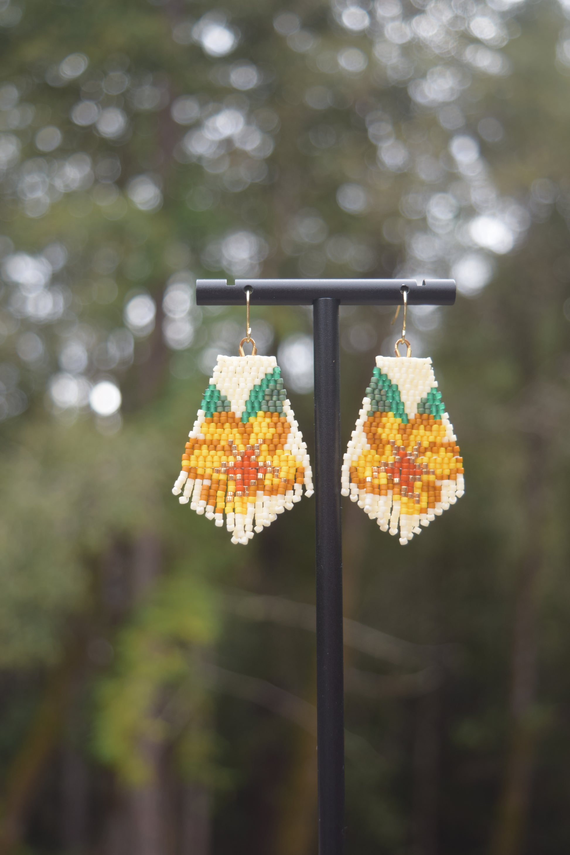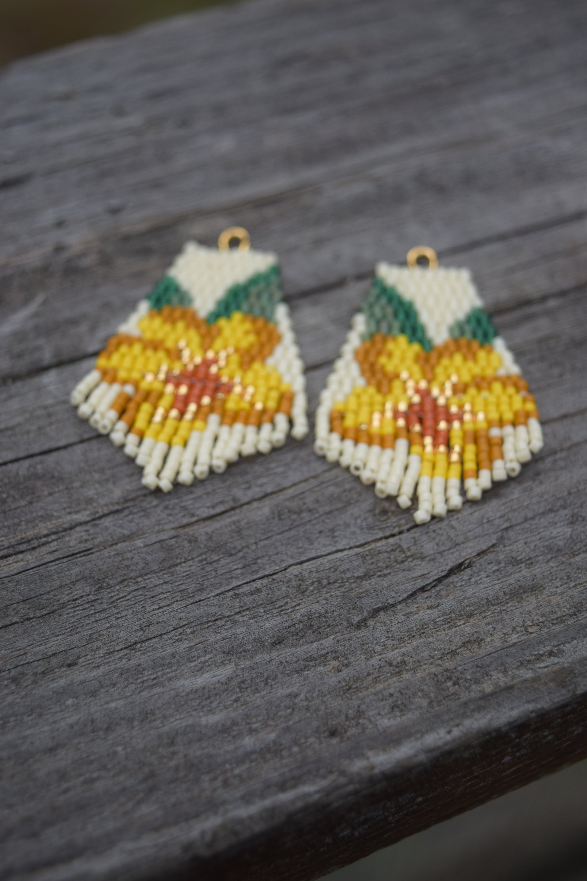 Embrace the warmth of fall with our hand-woven Yellow Flowers earrings! Intricately crafted using 11/0 Myuki Delica Glass seed beads, these earrings feature a double drop brick stitch and 14k gold plated hooks. Add a touch of elegance to your outfit with the vibrant colors of autumn.